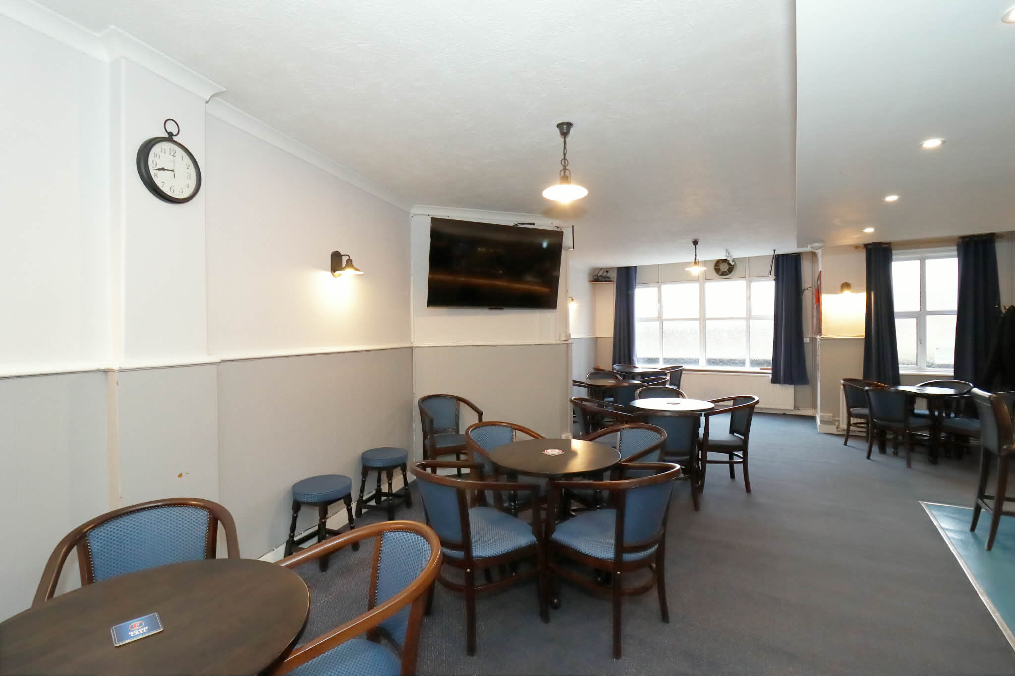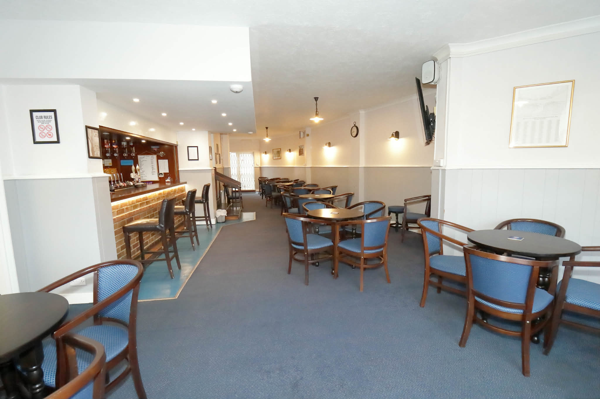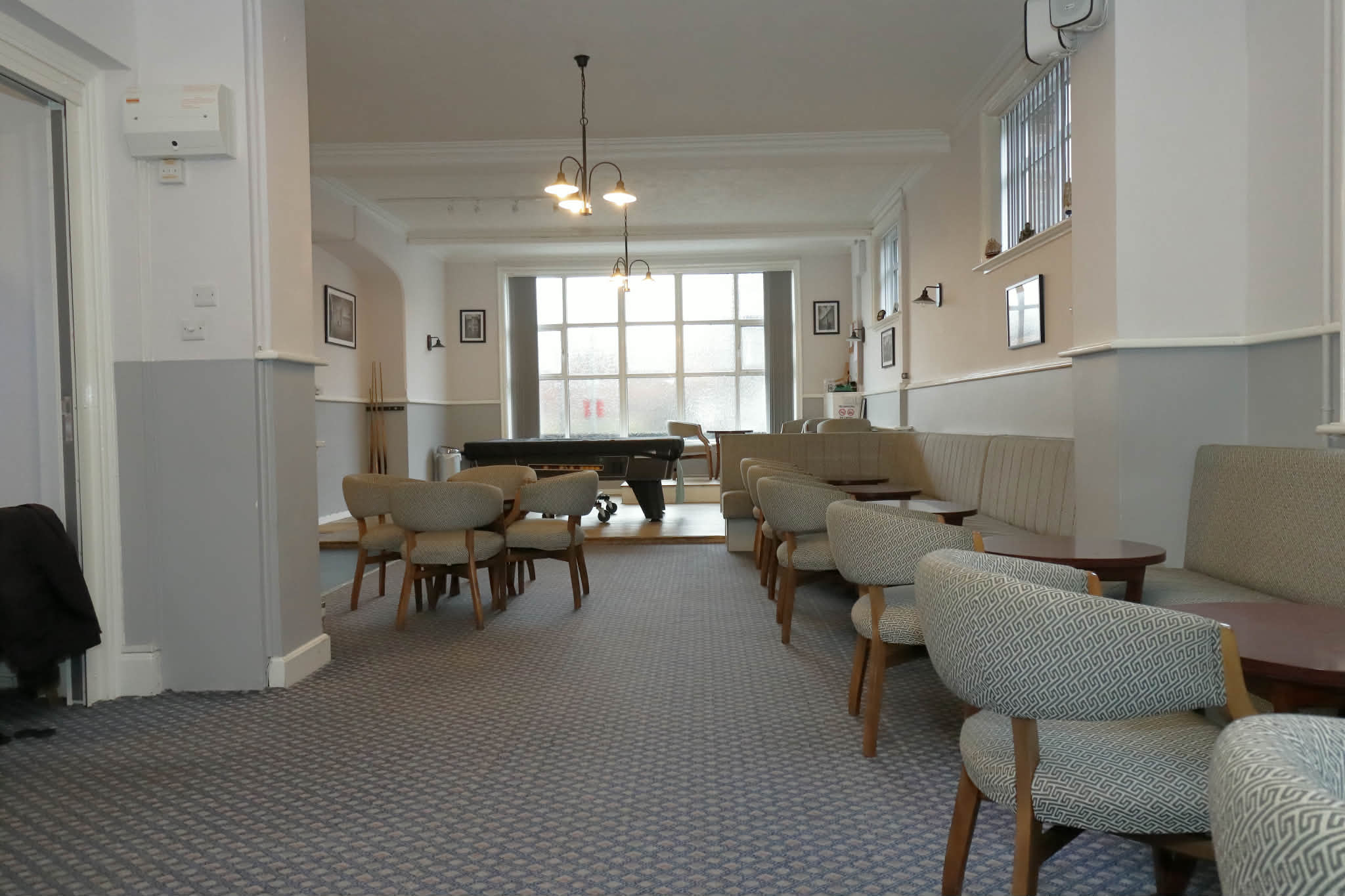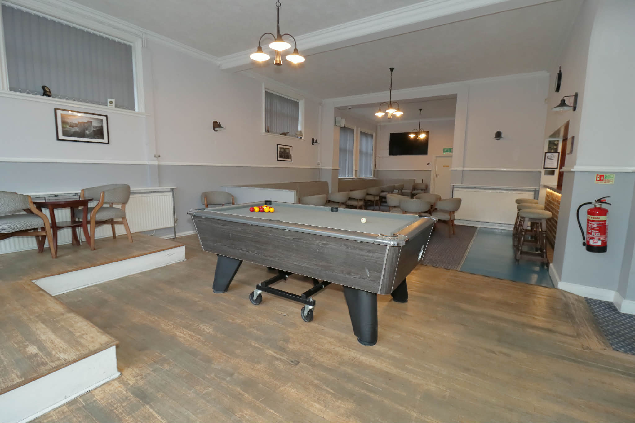 We have two large bar areas, one side with a free pool table. One side can be used for private functions. The other side has a dart board.